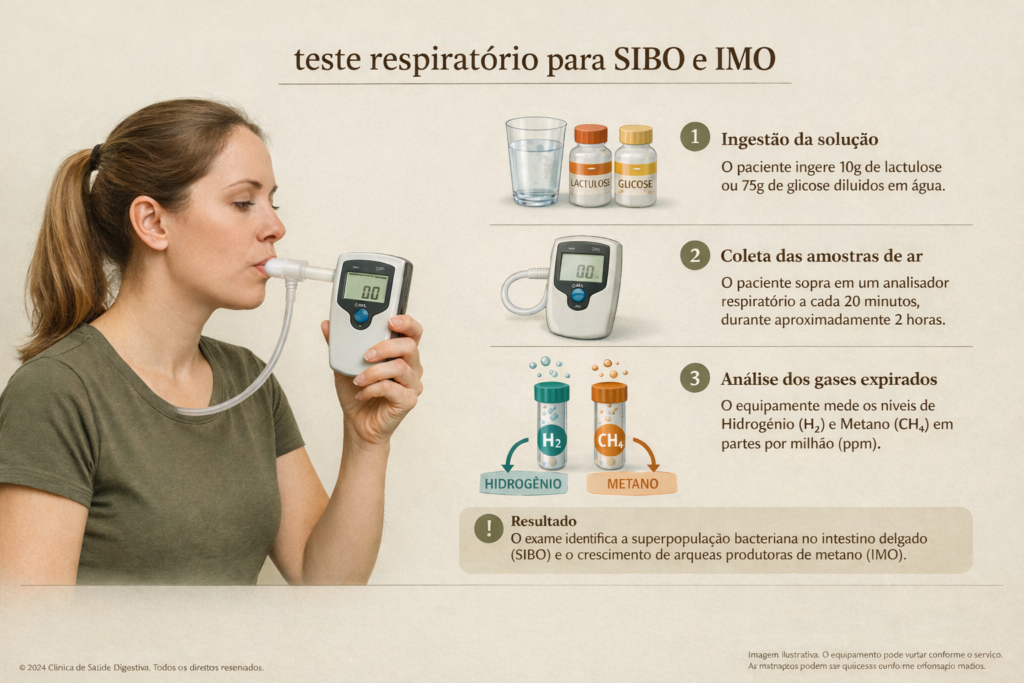 Na prática clínica, o exame mais utilizado é o teste respiratório. Durante o teste, o paciente ingere um líquido contendo glicose ou lactulose. Essas substâncias, ao entrarem em contato com as bactérias presentes no intestino delgado, sofrem fermentação e produzem gases, principalmente hidrogênio. Parte desse gás é eliminada pela respiração e pode ser medida ao longo de cerca de duas horas. Uma produção excessiva sugere a presença de SIBO.